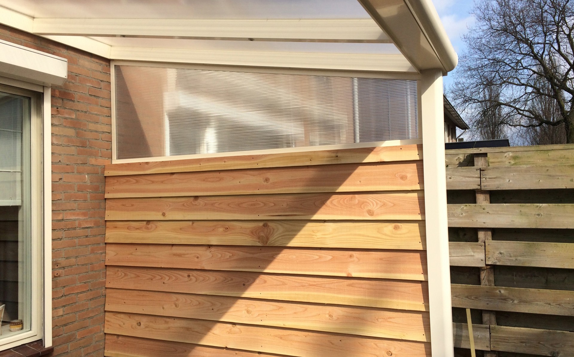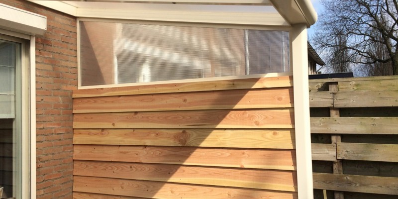 De zijspie is gemaakt van een aluminium frame en 16 mm dik polycarbonaat. Indien gewenst is deze tegen meerprijs uit te voeren in glas. Voor het frame kunt u kiezen uit de kleuren verkeerswit structuur (RAL9016), crème wit (RAL9001) of antraciet structuur (RAL7024), afhankelijk van de kleur van uw overkapping. U bestelt de zijspie eenvoudig mee, maar later monteren is uiteraard ook mogelijk. De zijspie is op al onze type terrasoverkapping te monteren.