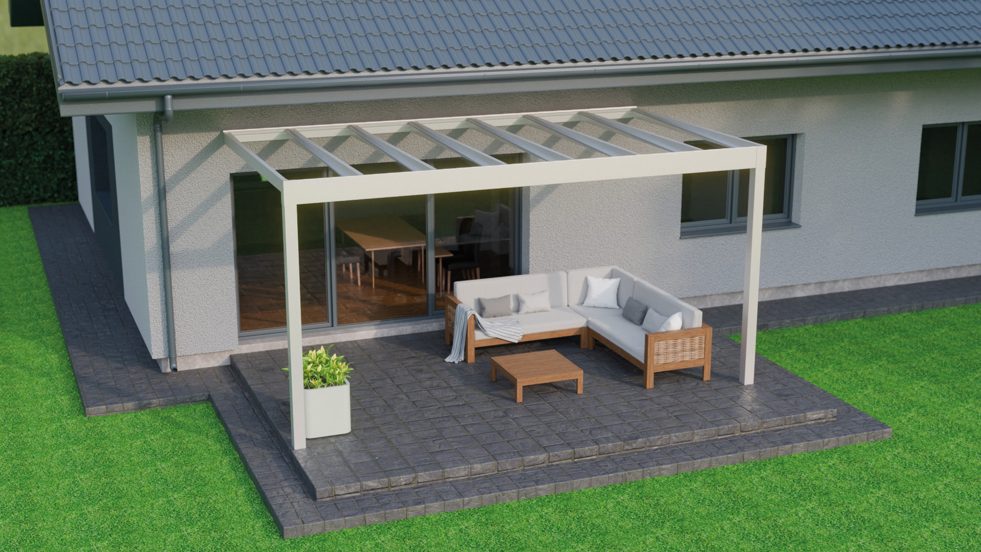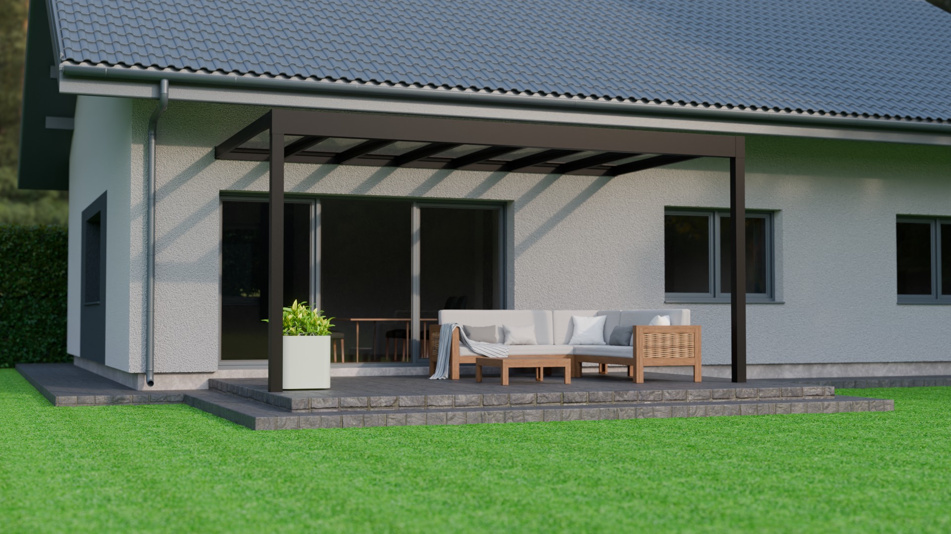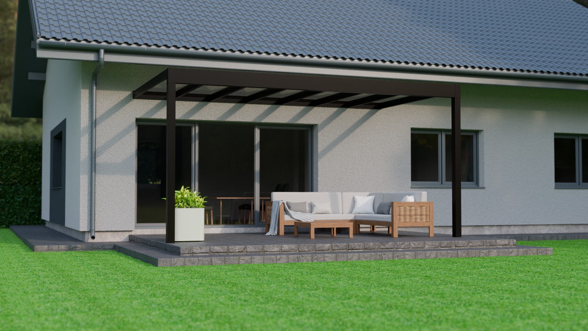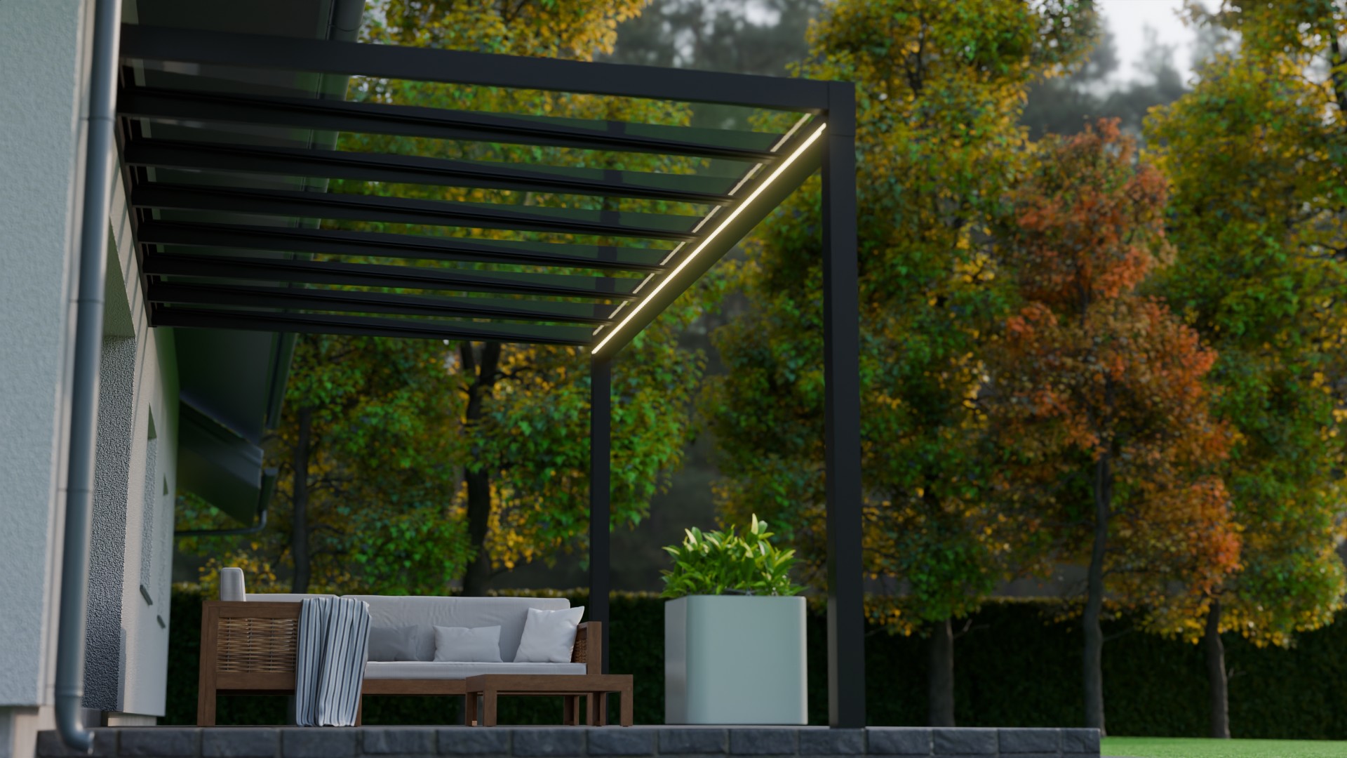 Lees meer +Een zomeravond waarin het zachte licht van de geïntegreerde LED verlichting de sfeer bepaalt. Onder de Trebbiano krijgt genieten met gezelschap een nieuwe betekenis. Deze kubistische en stijlvolle overkapping brengt verfijning en functionaliteit samen. Met een indrukwekkende overspanning van zeven meter, ondersteund door slechts twee staanders, biedt de Trebbiano ruimtelijke vrijheid. Bovendien zorgt het thermisch versterkte glas voor een ononderbroken zicht naar boven. Perfect om de sterrenhemel te bewonderen. Dankzij het rechte dak, is de Trebbiano veelzijdig inzetbaar, zelfs als carport.